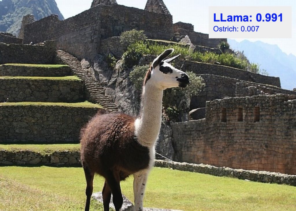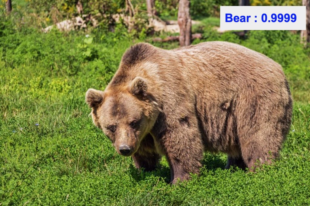Ci-dessous certains des résultats de classification sur les nouvelles données de test qui n'ont pas été utilisées dans la formation ou la validation. Les meilleures classes prédites pour les images avec leurs scores de probabilité sont superposées en haut à droite. Comme nous le voyons ci-dessous, la classe prédite avec la probabilité la plus élevée est souvent la bonne. Notez également que la classe avec la deuxième probabilité la plus élevée est souvent l'animal le plus proche en termes d'apparence de la classe réelle parmi les 9 classes restantes.