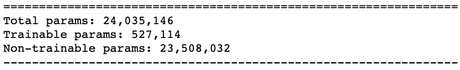 Un appel de fonction récapitulatif au modèle peut révéler le nombre réel de paramètres et le nombre de paramètres pouvant être entraînés. L'avantage que nous avons dans cette approche est que nous n'avons désormais besoin de former qu'environ un dixième du nombre total de paramètres du modèle.